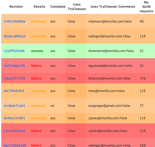 Our fabulous intern Anamaria Stoica has been working hard the past few months helping to pull data from buildbot’s scheduler DB that allows us to learn all sorts of new information about how the release infrastructure is being used, and how it could be optimized. Among other things, she’s generated an end-to-end report so we can see at a glance how long the complete build cycle for any push to mozilla-central took. Now, on top of that, she’s added a way to see who is using the awesome new TryChooser syntax.