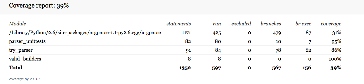 In today’s work on the parser I wrote python unittests for the first time. I remember doing some unittests in school but that was way back when we used Java. The python unittest module is really awesome and easy to get up and running. Once I had my tests passing I then ran the coverage tool on both the test suite and the parser to see how I did in covering all my bases: